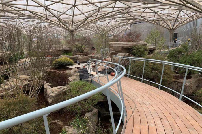 另一个重点项目——植物园,以亚克力材质的伞形建筑而闻名,总共有42把巨大伞状建筑,占地约1000平方米。事实上,亚克力材质是一种极脆而致密的材料,因此现场施工和维护非常困难,但更可贵的是,通过科学的设计,在雨伞上方设计了一条水流,利用水对于光的吸收和反射特性,以及亚克力材料的隔热特性,保证了园内绿色植物的采光需求的同时,隔绝多余热量,形成自然空调。